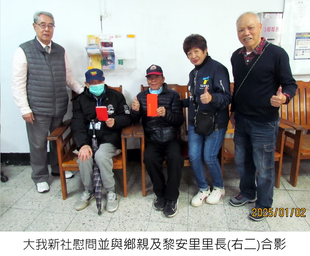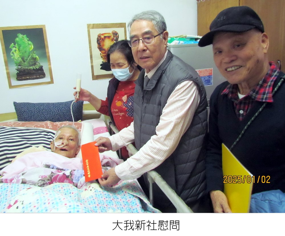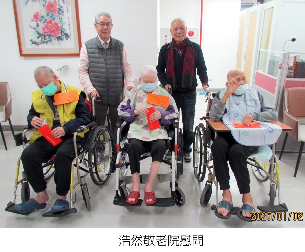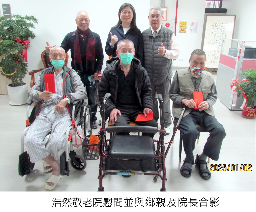 本會為關懷粵籍年長鄉親,特於年節前,由本會韓介光理事長、蕭世雄常務理事、何凱文組長,於元(114.01.02 )114年春節送暖 關懷粵籍長者活動月二日(星期四)上午前往台北市浩然敬老院暨榮民之家大我新舍,慰問無依老弱同鄉並致贈慰問金壹仟元。浩然敬老院及榮民之家均對本會之愛心善舉表達衷心感謝之意。