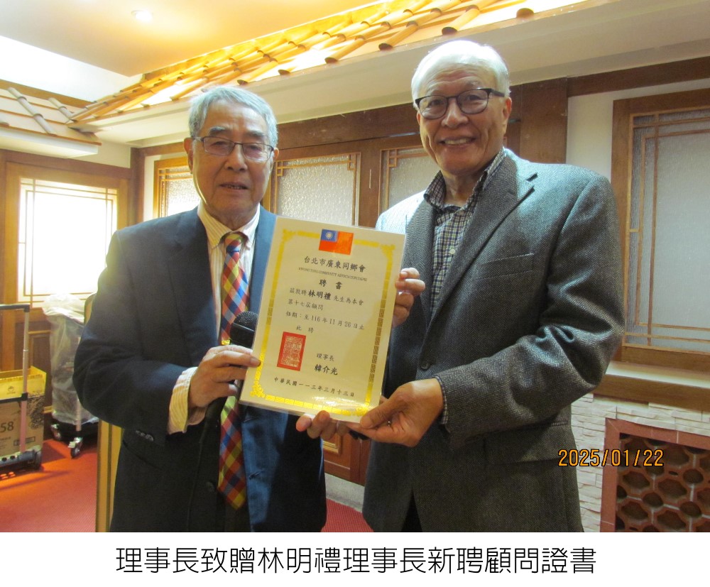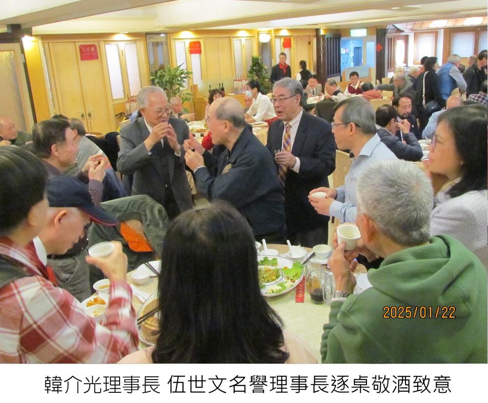 (114.01.22)台北市廣東同鄉舉辦一一四年尾牙餐會報導 台北市廣東同鄉會為了答謝多年來支持本會的各同鄉社團及鄉長鄉前輩,韓介光理事長偕同所有理監事們,特邀名譽理事長、名譽理事及粵籍各同鄉會理事長、顧問,於 一一四年一月二十二日(星期三)中午十二時,假台北市真北平餐廳二樓舉行年終尾牙餐會,來賓們踴躍到會。 宴席間觥籌交錯,相談甚歡,氣氛融洽。韓介光理事長及伍世文名譽理事長於餐會中逐桌敬酒致意,氣氛熱絡。 餐會結束後,本會致贈與會來賓年節禮盒一份以表心意,餐會於十四時圓滿結束。 活動相片 回上一頁